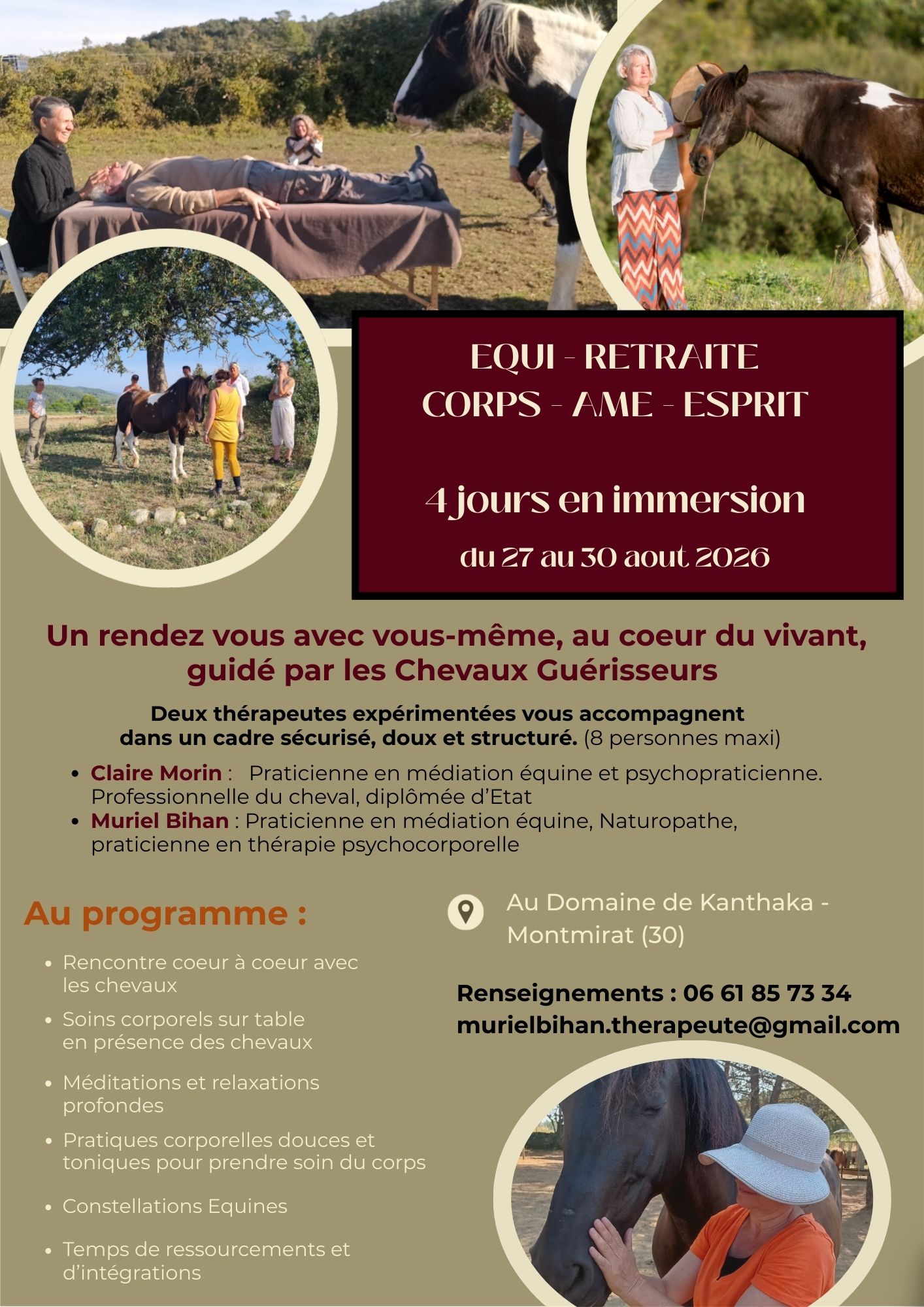 A travers le concept Caval’essence, j’ai élaboré ma propre méthode d’accompagnement de l’Etre sur la Voie du cheval. Je suis la gardienne d’un espace naturel entièrement dédié à la relation homme-cheval et à l’agro-écologie équine, le Domaine équestre de Kanthaka, dans le piémont Cévénol (Montmirat – Gard) »
